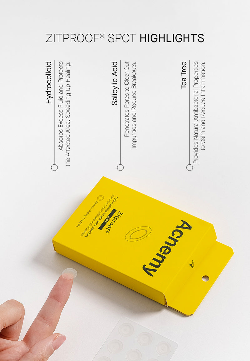 How does Zitproof® Spot work? Its hydrocolloid technology base creates an environment that provides optimal conditions to help accelerate healing and reduce swelling and redness. In addition, we have infused each of the patches with Salicylic Acid and Tea Tree to prevent the appearance of new pimples and help calm redness and swelling.