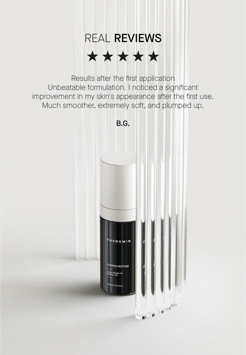 Discover the power of COPPER PEPTIDE, the most revolutionary formulation with the highest concentration of pure copper peptides on the market. It guarantees maximum efficacy and offers unparalleled benefits for firm, smooth, radiant and younger-looking skin.